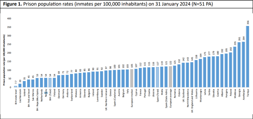 31 Ocak 2024 tarihli raporda, Türkiye’de her 100 bin kişiye 356 mahpus düştüğü belirtilirken Türkiye’yi 264 ortalama ile Azerbaycan, 261 ortalama ile Gürcistan, 235 ortalama ile Moldova gibi ülkeler takip etmektedir.